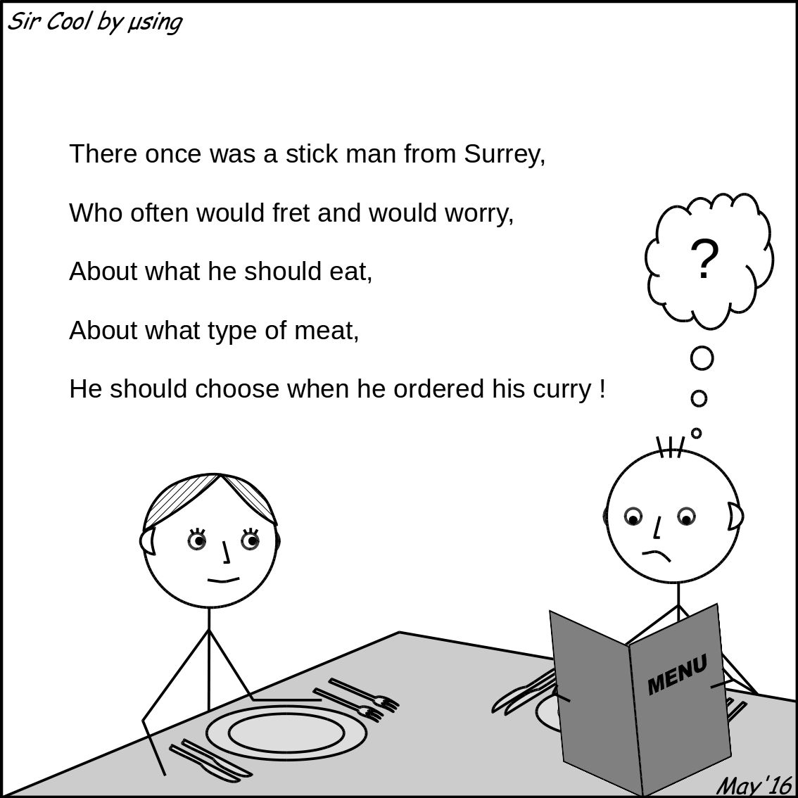 Written by Musing7527th May 20164th Apr 2018 Curry More limericks at https://musing75.wordpress.com/limericks/ Share this:Tweet Click to share on WhatsApp (Opens in new window) WhatsApp Click to email a link to a friend (Opens in new window) Email Like Loading... Leave a comment Cancel reply Δ
