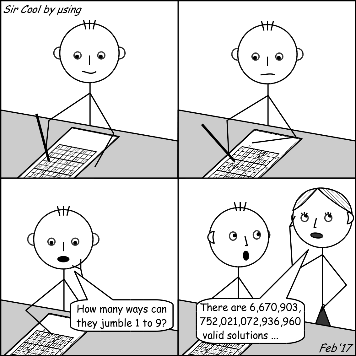 Written by Musing7513th Feb 2017 Sudoku Ever wondered? Well now you know, thanks to a calculation by “QSCGZ”, later confirmed by Felgenhauer and Jarvis … Share this:Tweet Click to share on WhatsApp (Opens in new window) WhatsApp Click to email a link to a friend (Opens in new window) Email Like Loading... One thought on “Sudoku” Greaat post thanks LikeLike Reply Leave a comment Cancel reply Δ