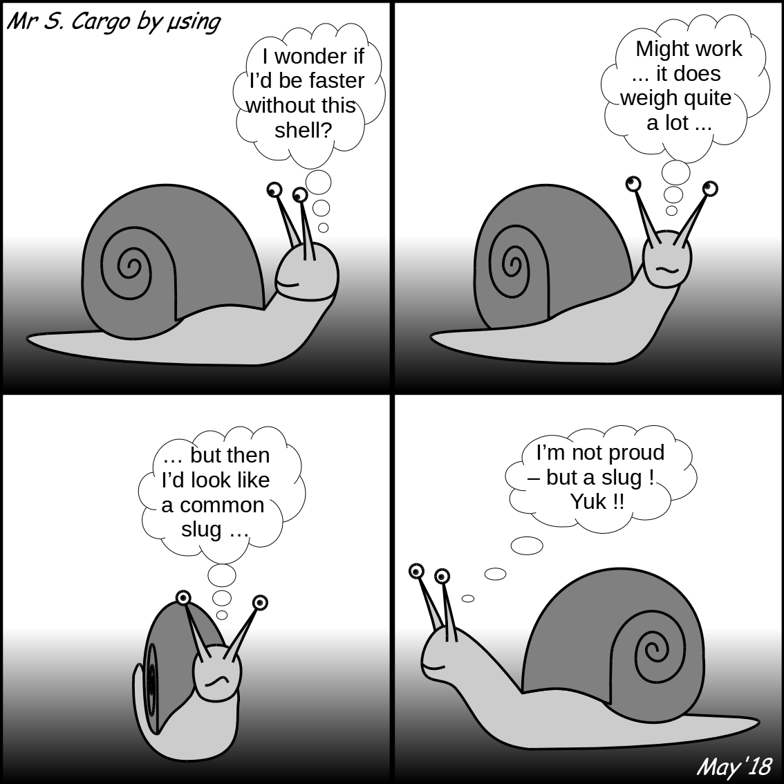 Written by Musing7523rd May 2018 Slug! Wonder what the slugs think about snails? Share this:Tweet Click to share on WhatsApp (Opens in new window) WhatsApp Click to email a link to a friend (Opens in new window) Email Like Loading... Leave a comment Cancel reply Δ