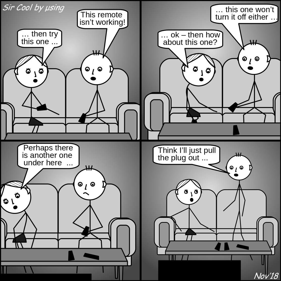 Written by Musing7522nd Nov 2018 Remote Always assuming that one has the willpower to press the TV “off” button in the first place … Share this:Tweet Click to share on WhatsApp (Opens in new window) WhatsApp Click to email a link to a friend (Opens in new window) Email Like Loading... Leave a comment Cancel reply Δ