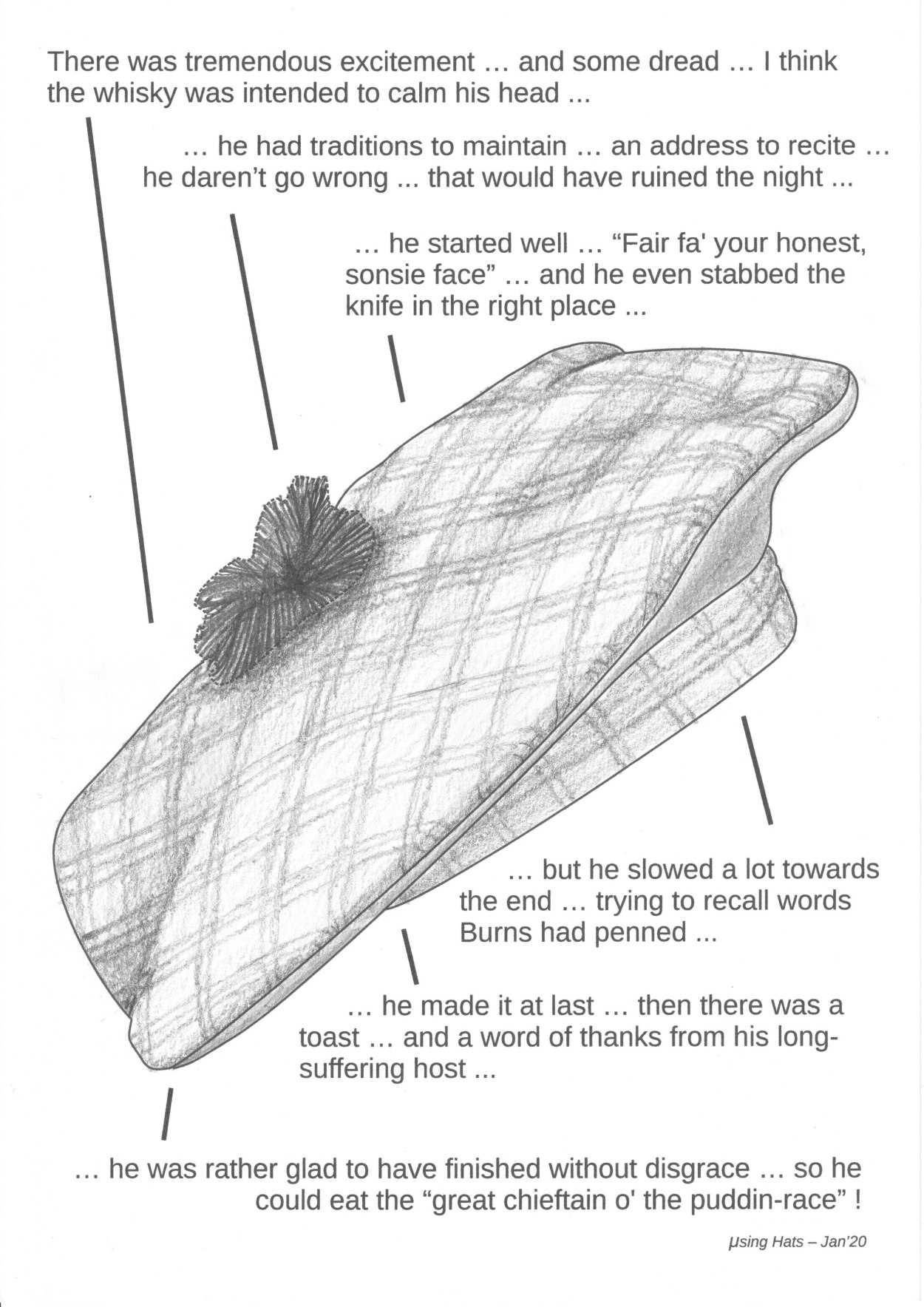 Written by Musing7526th Jan 2020 Burns Though I’m not sure who would wear a hat whilst addressing the haggis? More hat musings available … Share this:Tweet Click to share on WhatsApp (Opens in new window) WhatsApp Click to email a link to a friend (Opens in new window) Email Like Loading... Leave a comment Cancel reply Δ